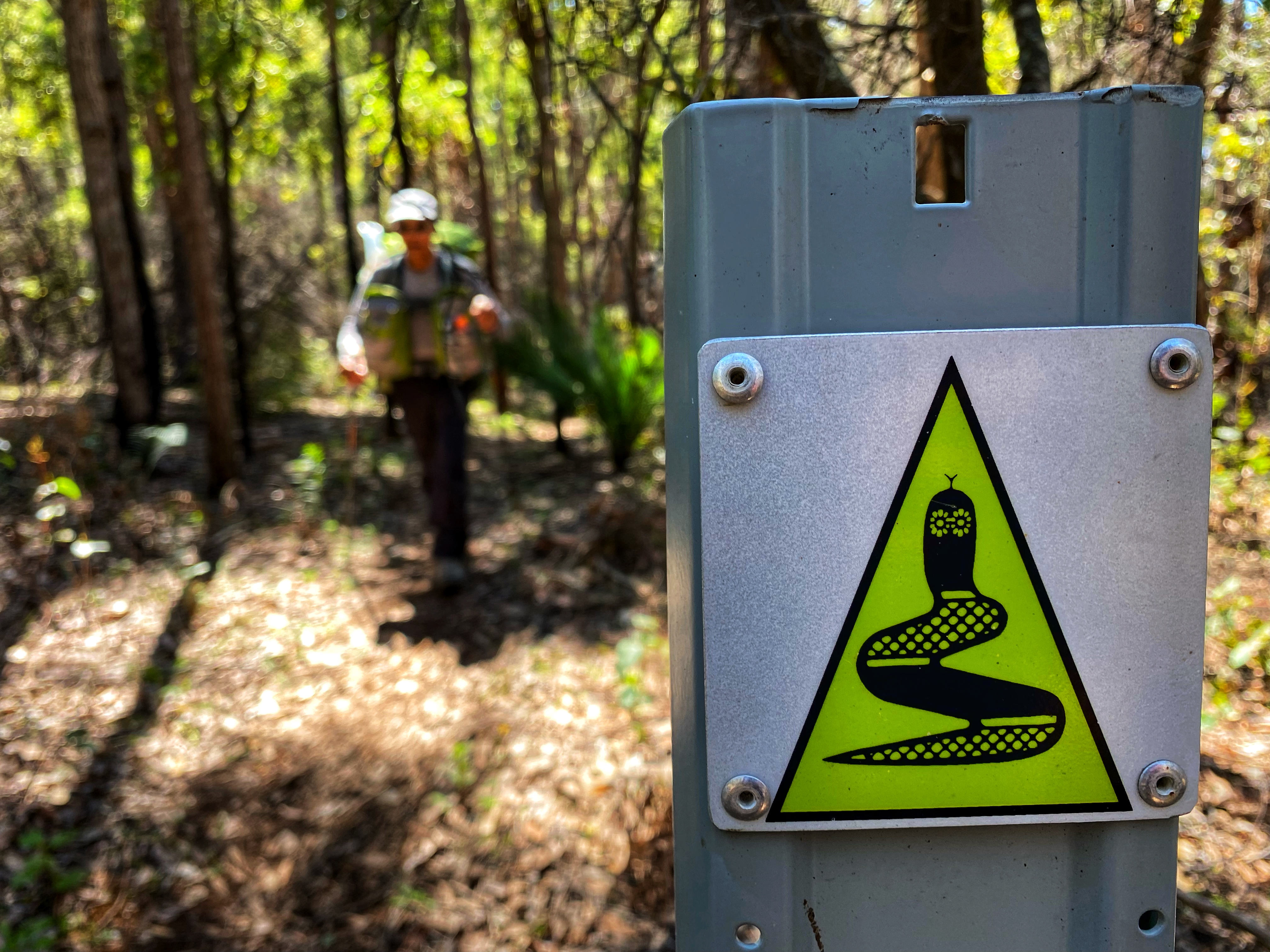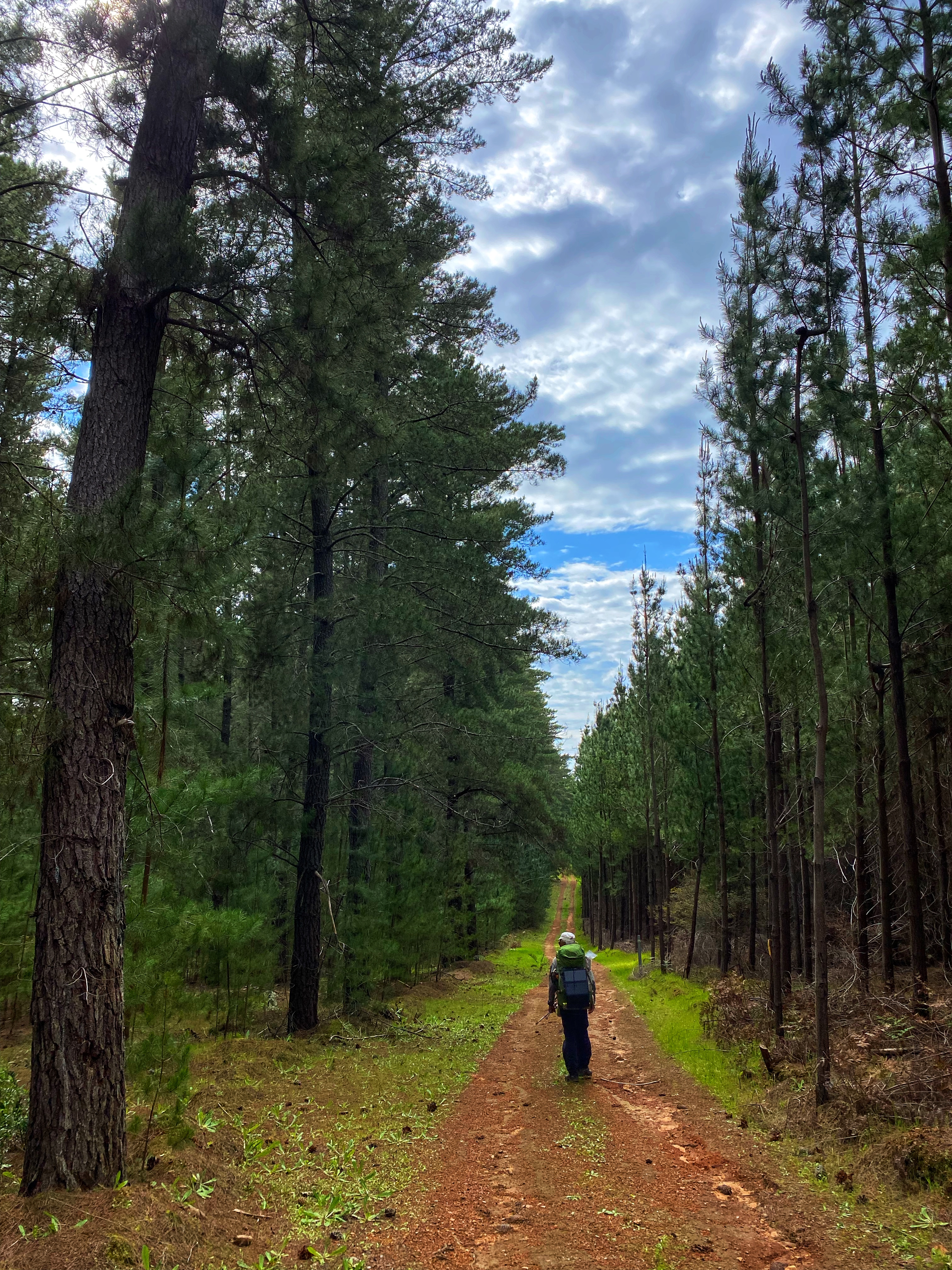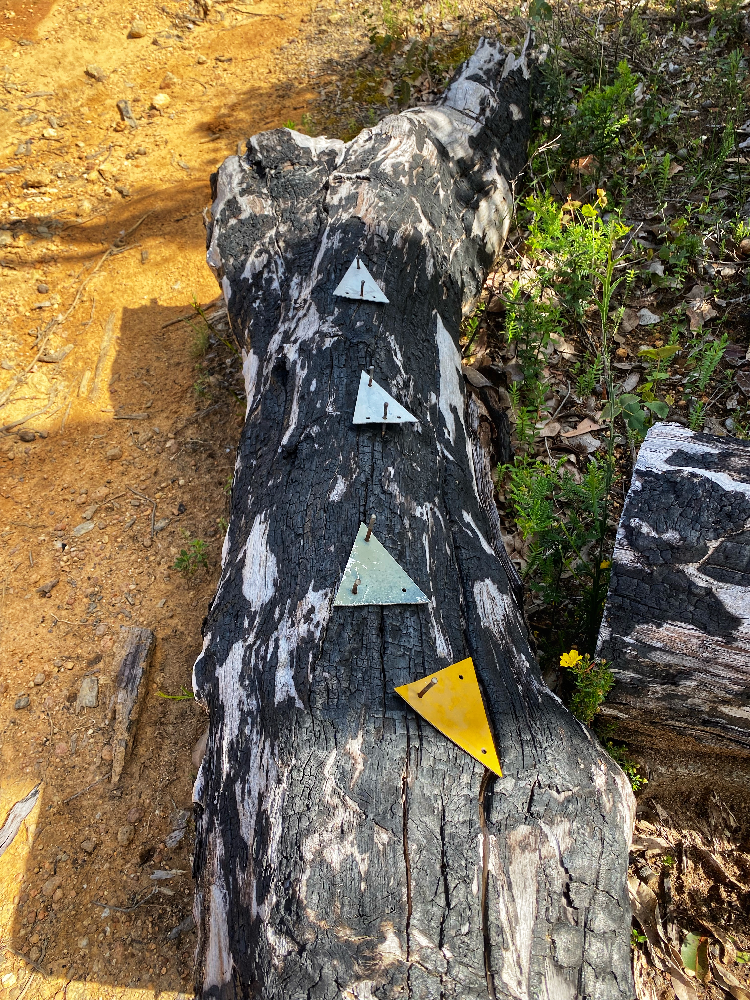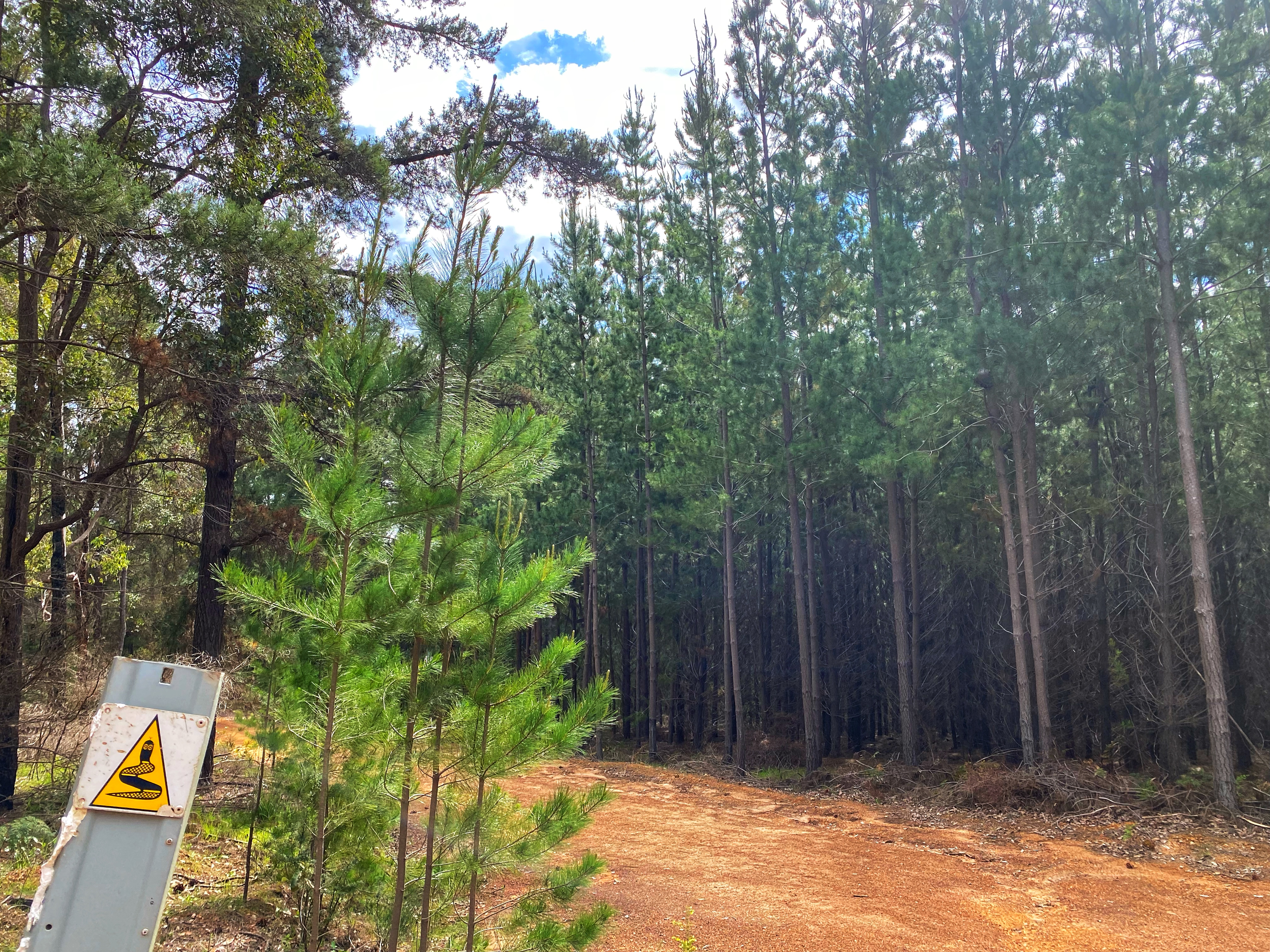 We are up nice and early, having our quick breakfast, packing up the tent and heaving our backpacks back on. I start off fresh, feeling good besides the tight soreness in my glutes and calf muscles. The distance ends up being 17kms, for some reason we were expecting it to be longer. Most of the way through Forest is flat, wide tracks with many more Silky Blue and Bird Orchids to see. The clubbed and leaping Spider Orchids are also in abundance. Ambles is struggling from the get-go. Especially a long steep hill incline that appears really takes the wind out of our sails. We pass through pine plantations and there is a ridiculous diversion that must add on an extra kilometre. Some of the waugal markers are the actual Bibbulmun yellow and black ones, some green & black. Maybe they ran out of the green and black ones. We instantly feel back at home.