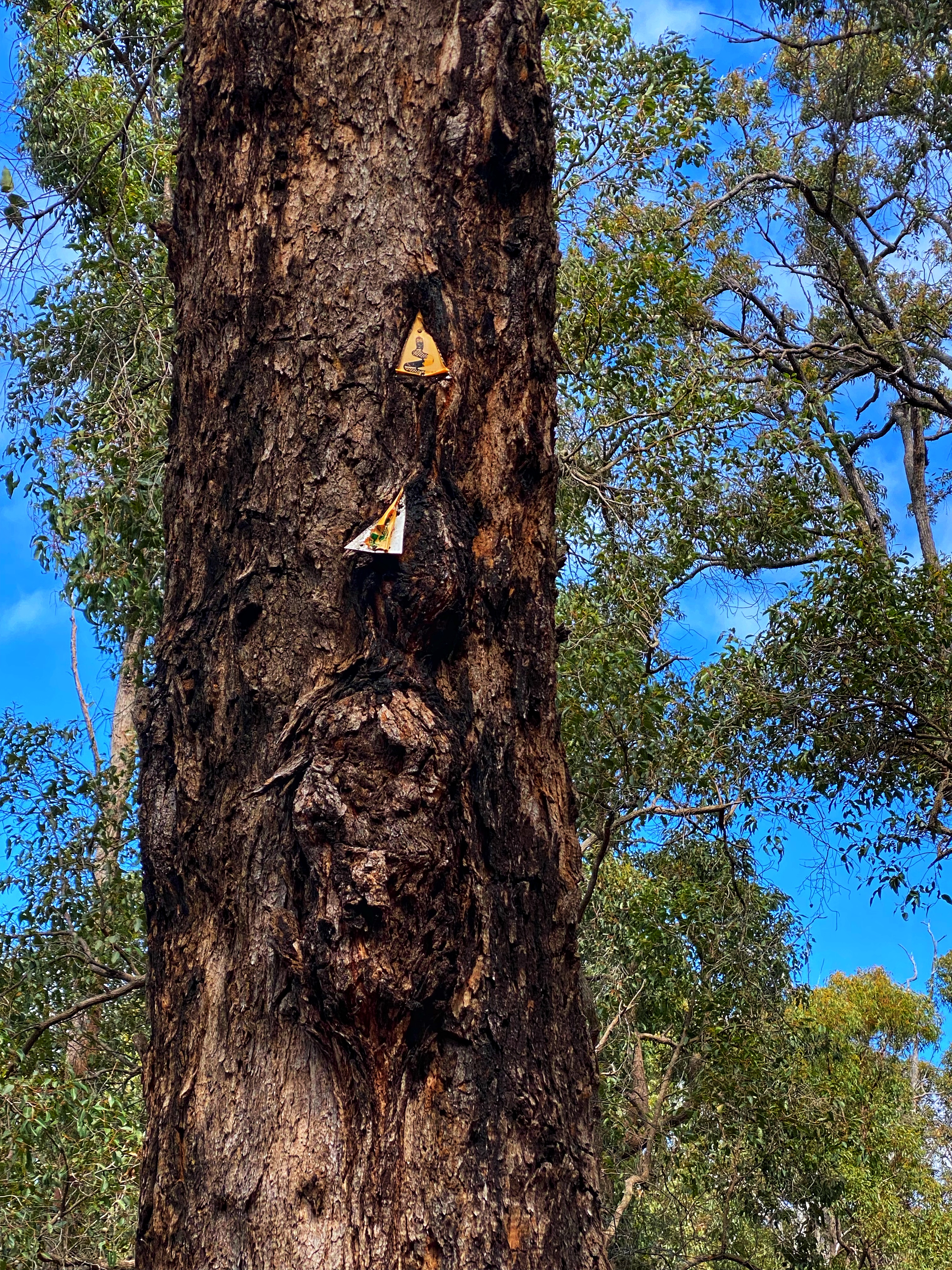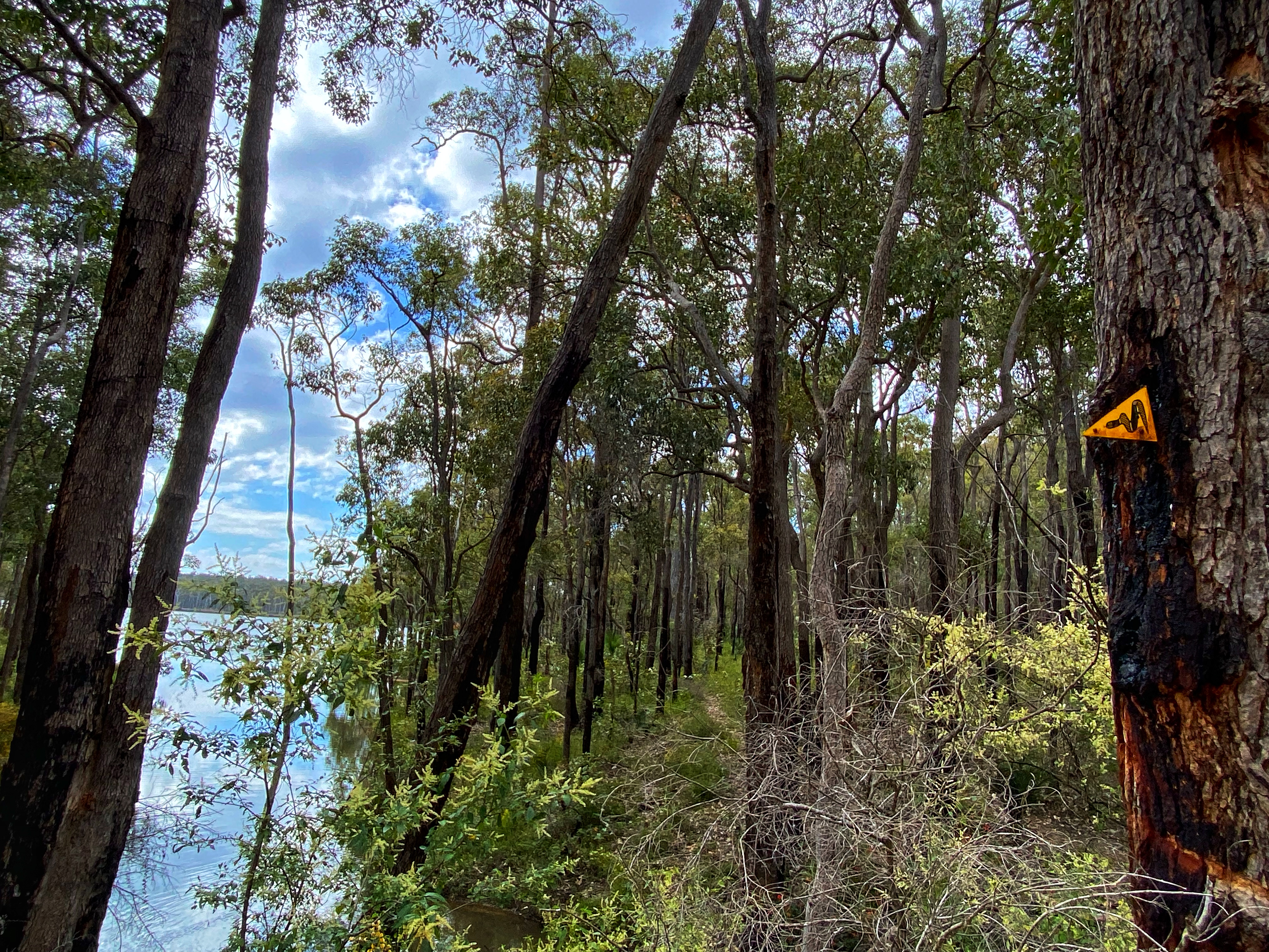 The river providing some little rapids in parts to stop and watch. A toilet block stands alone not far into the walk, seemingly out of place and must of been part of a campsite at one stage. The interesting part of this walk is that it used to be part of the Bibbulmun Track before the Bibbulmun was realigned in the late 1990’s. Right near the end there remains one recognisable Bibbulmun waugal marker still on a tree, though it now is way above eye level as been there so long and the tree has grown more since its placement. We could have turned right at the road that takes you below the Wellington Dam wall but there is no signage here to indicate the Wellington Spur Trail. We turn left and finish the last kilometre of the trail which proves the hardest, straight up a nice steep incline. At the top, the trail ends and spits you out near the cafe. Perfect opportunity to recover over a coffee and shared carrot cake. It is almost the long weekend and there are enough tourists, day walkers and bicycle riders about to fill the air with busy ness. We seem to be the only two fools walking around with houses on our backs.