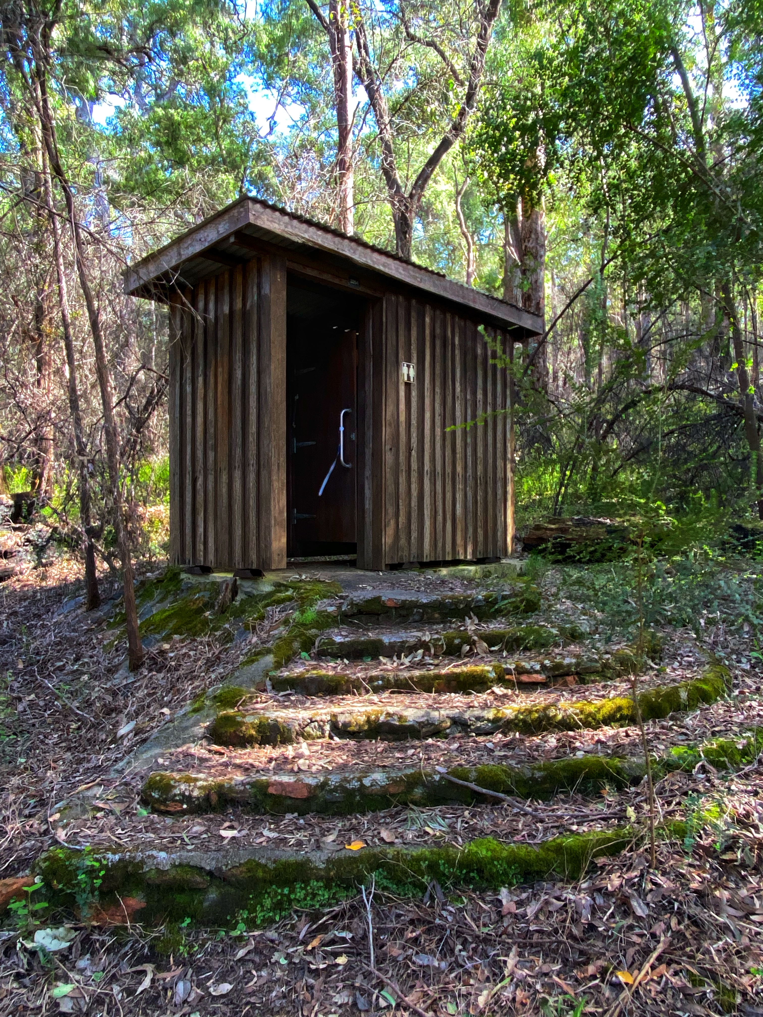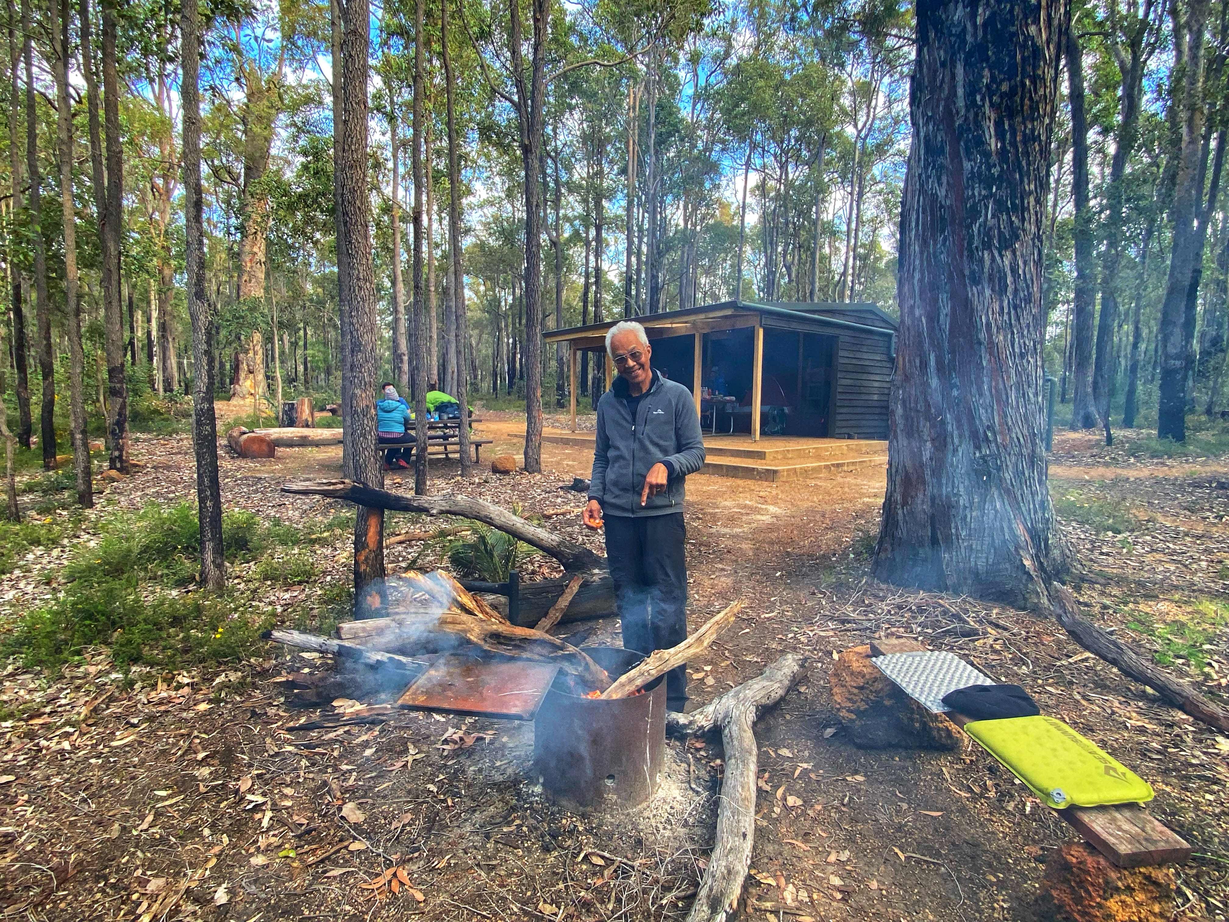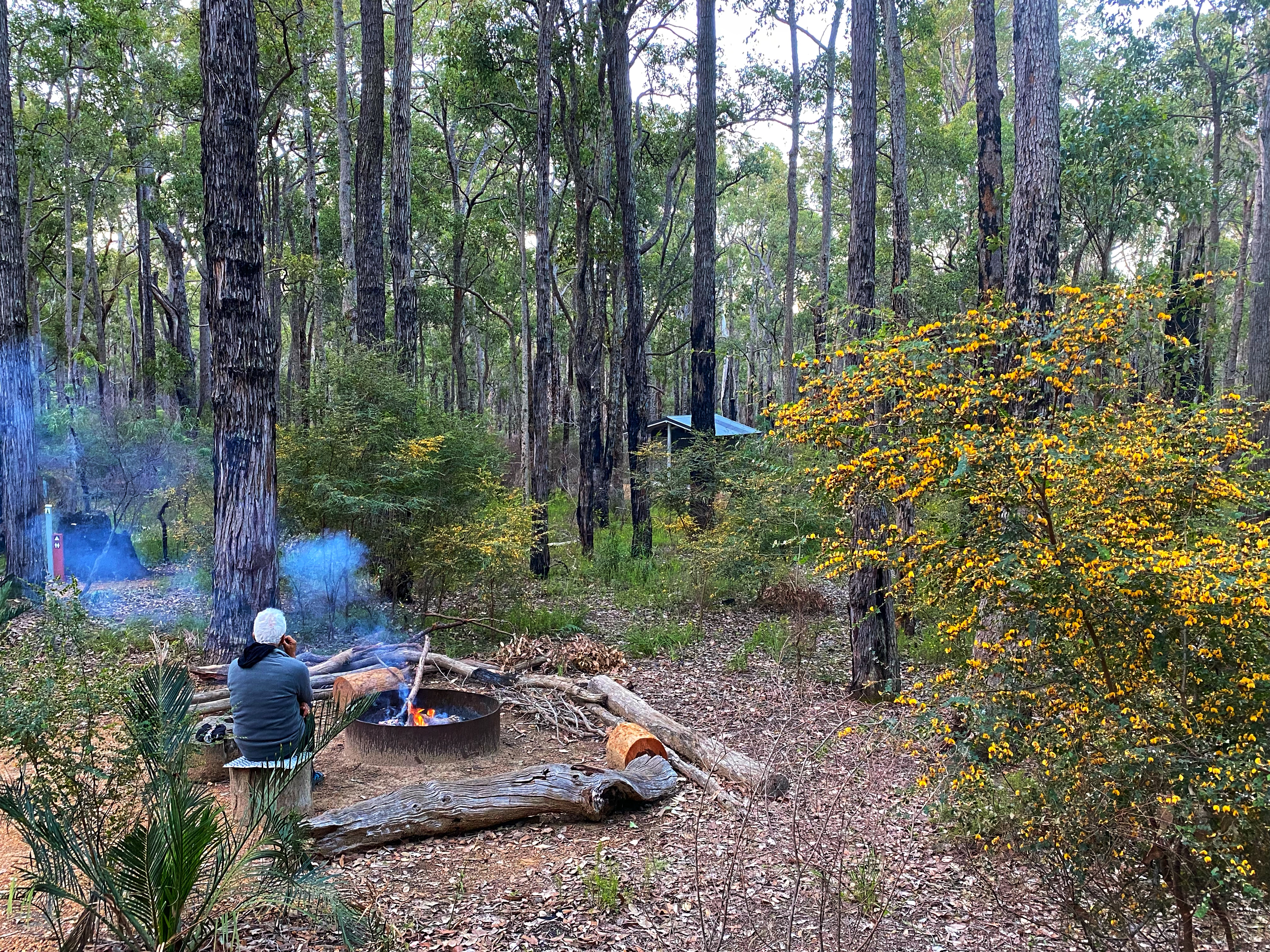These campsites are different to the Bibbulmun in that they are even better. Equipped for large groups there is a large communal shelter roof over two picnic tables. Ample tent sites. Two large toilet blocks, not the standard narrow toilet rooms you can’t comfortably get changed in on the Bibbulmun. And a large group sized campfire. Don’t forget – and water tank! There was no mention of water tanks at either campsite so I carried extra water in. Always better to be prepared just in case! Ambles thinks why not set up the tent under the shelter near the picnic table. But just in case someone turns up, we decide to set up in one of the designated tent sites.