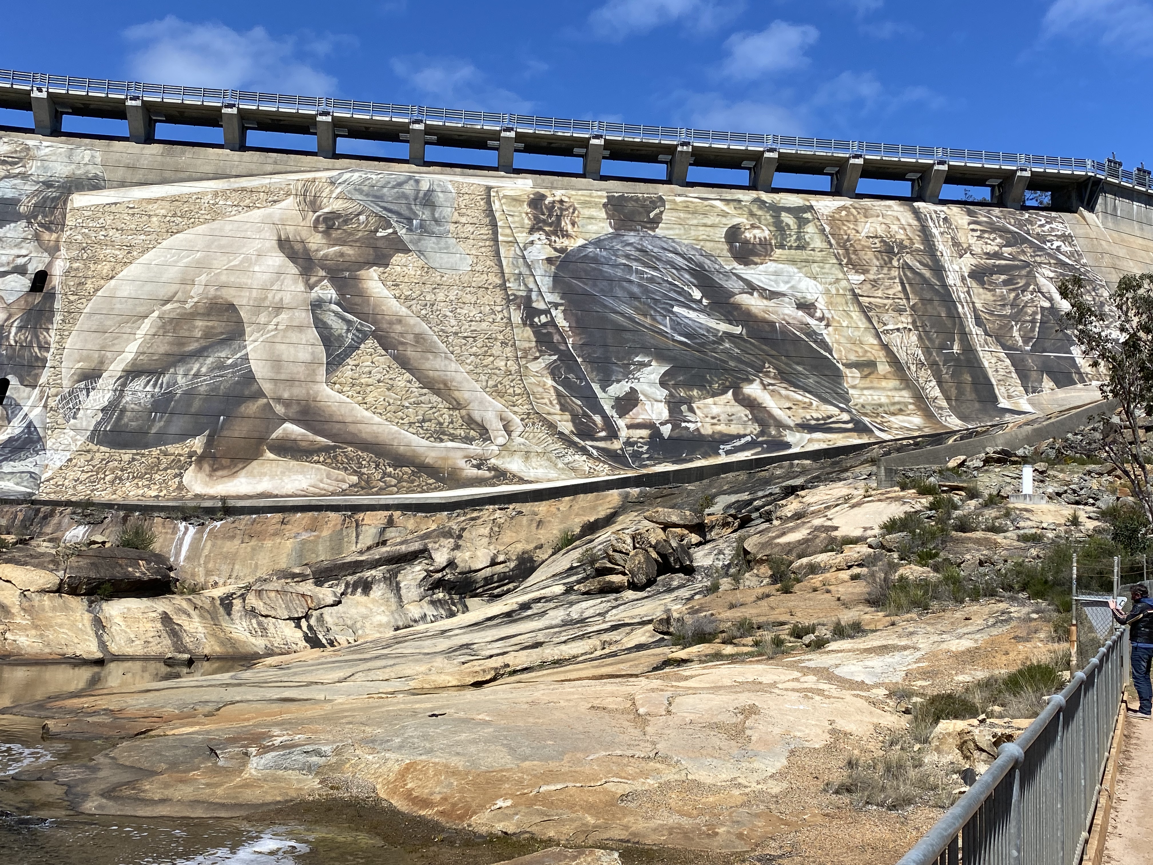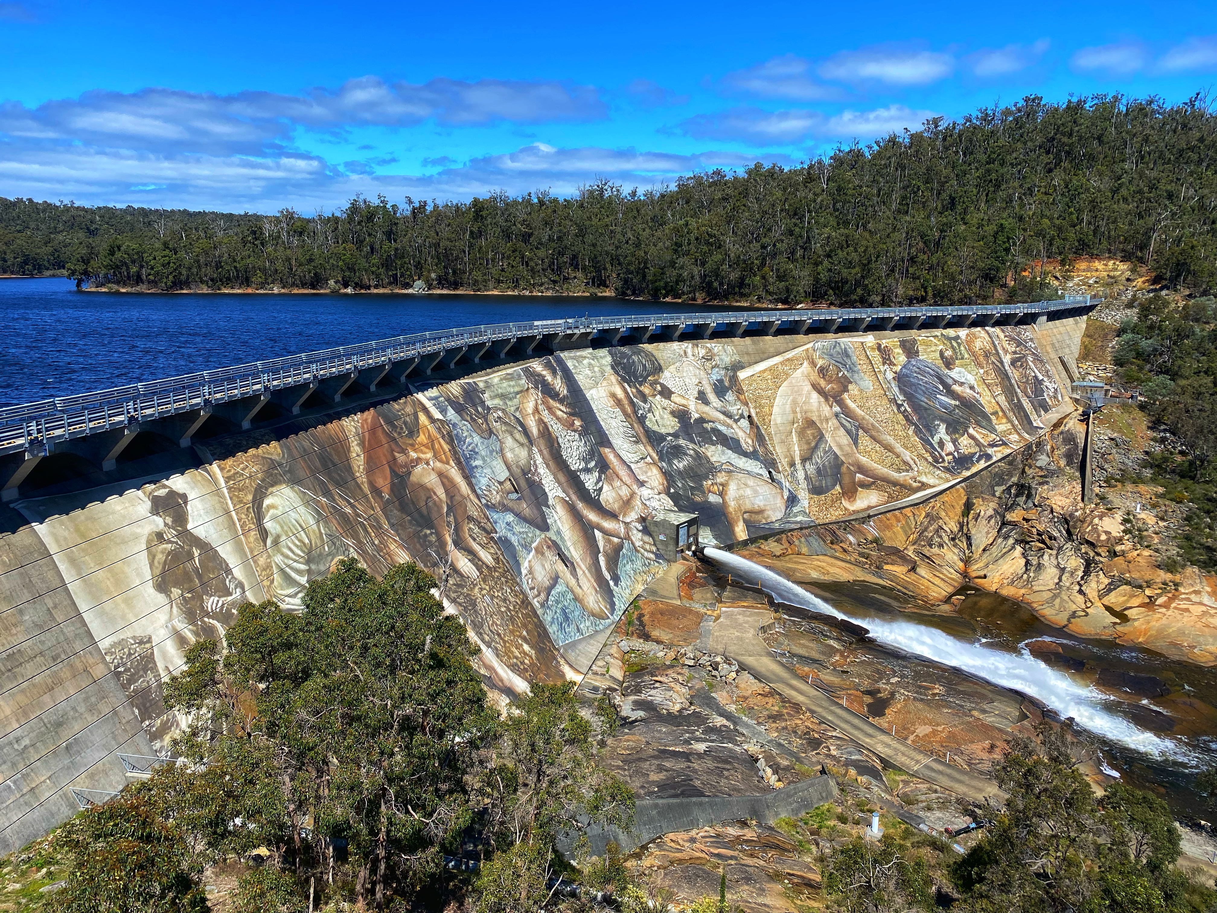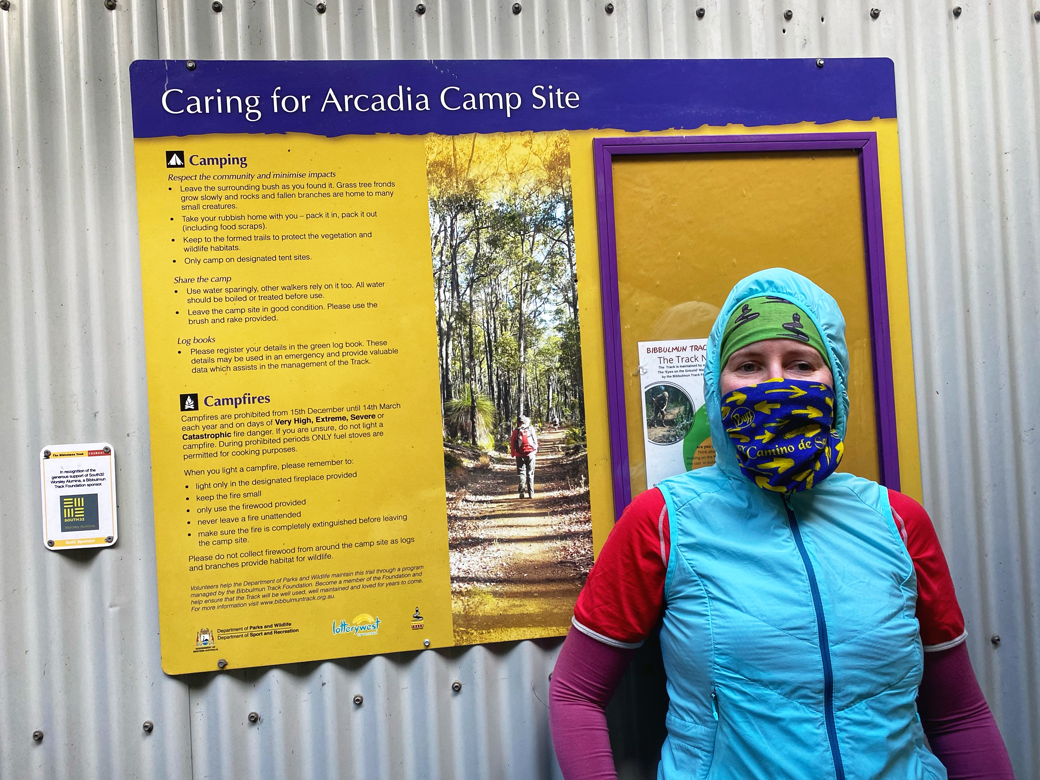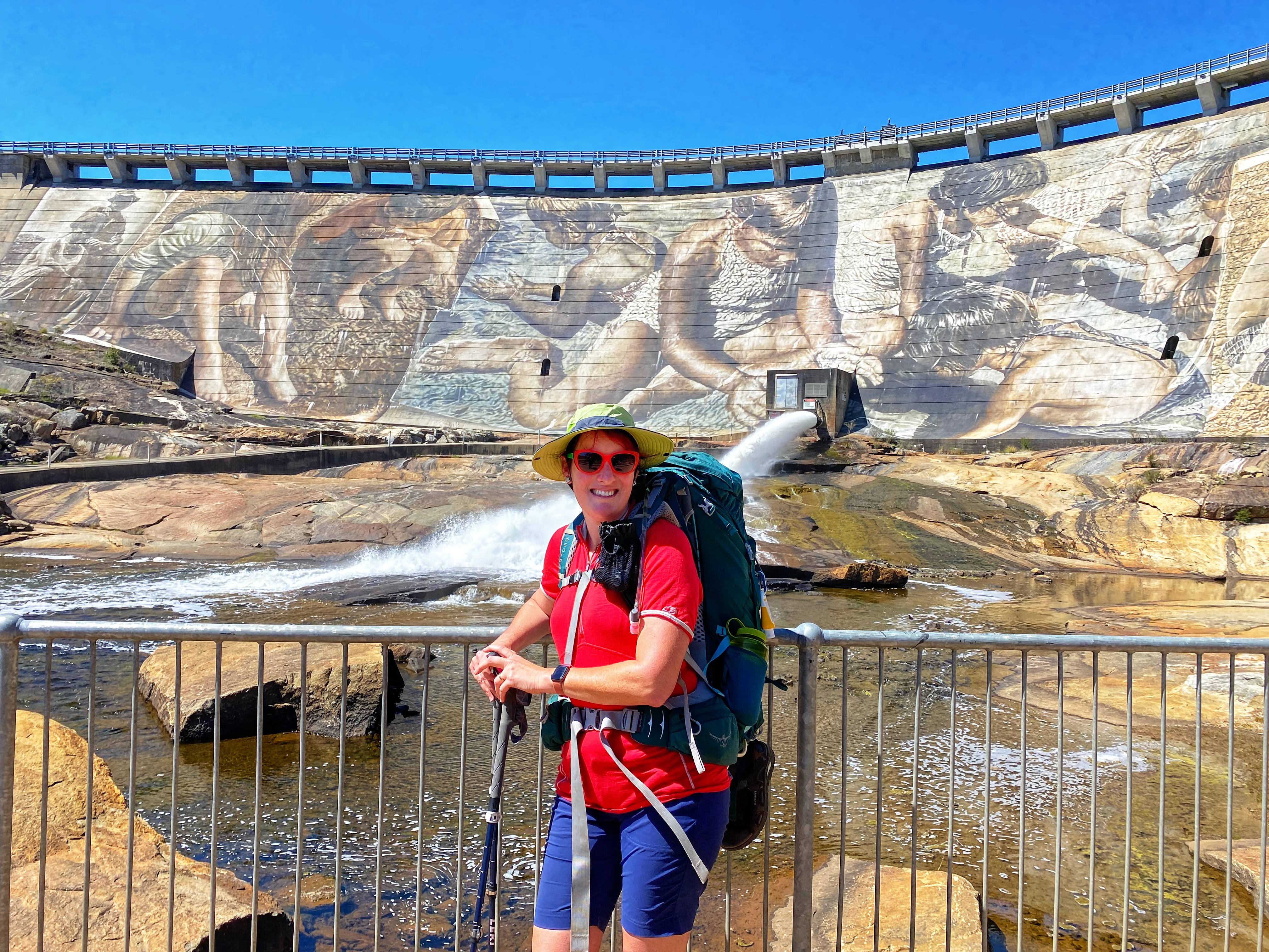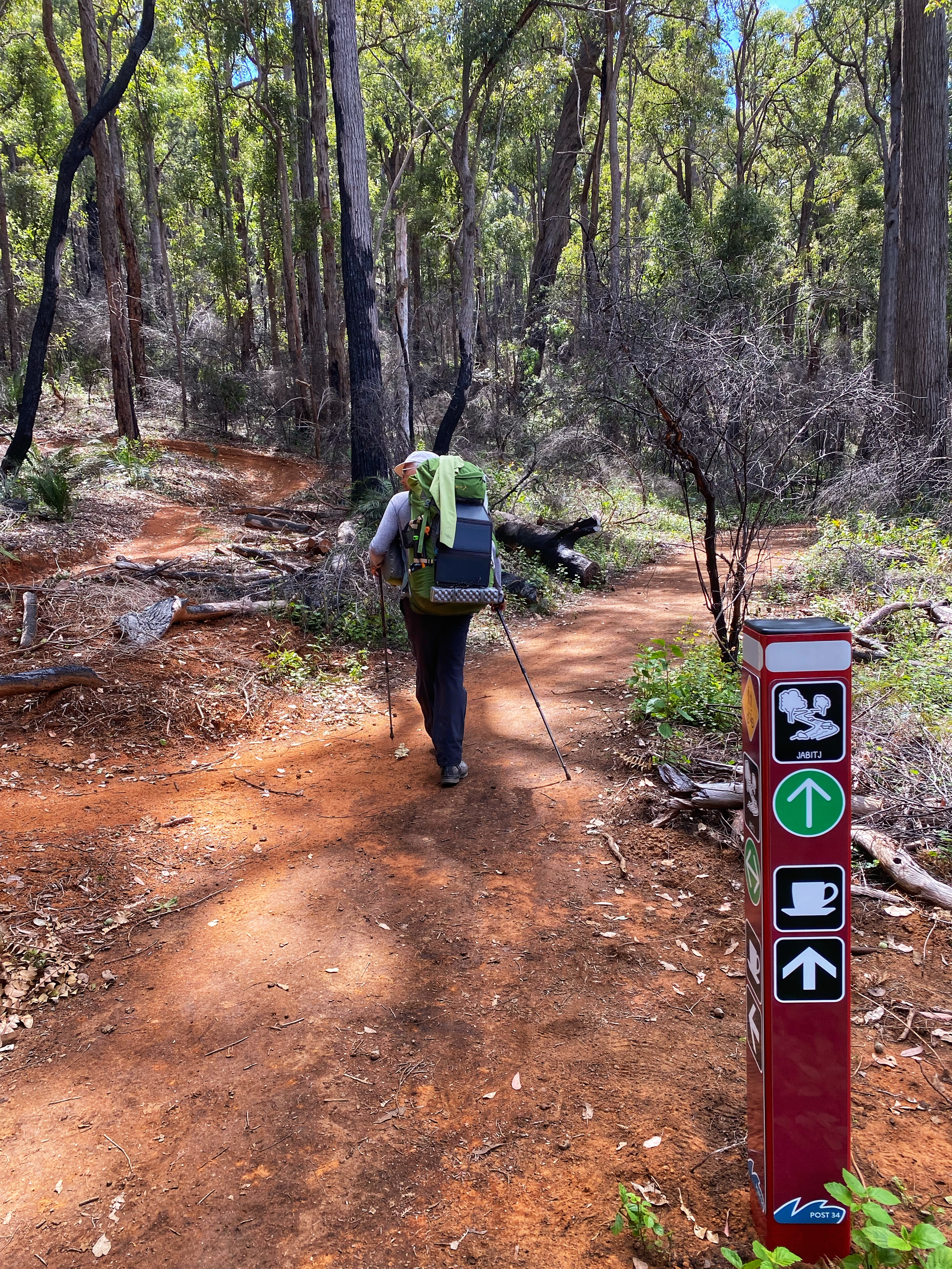Lucky we had a pleasant sunny cool day as we backtracked back down to the road and went across below the Wellington Dam wall, thus admiring the new fantastic art mural across the whole wall. Still no indication where the Spur Trail was we continued about 200 metres up the road with Ambles threatening to catch a lift back to Collie and yahhhh! We spotted the trail head signage for the Bibbulmun Wellington Spur Trail, a 20km one way trail connecting the Wellington Dam and Bibbulmun Track. The marker signage is a green and black waugal marker just like the Bibbulmun yellow and black. We had 3.5kms to Arcadia campsite, the one of two along this trail and designed as a group campsite. We were tired from stopping at the cafe and had to get our momentum going, for Ambles and his 22kg backpack this was harder to achieve.