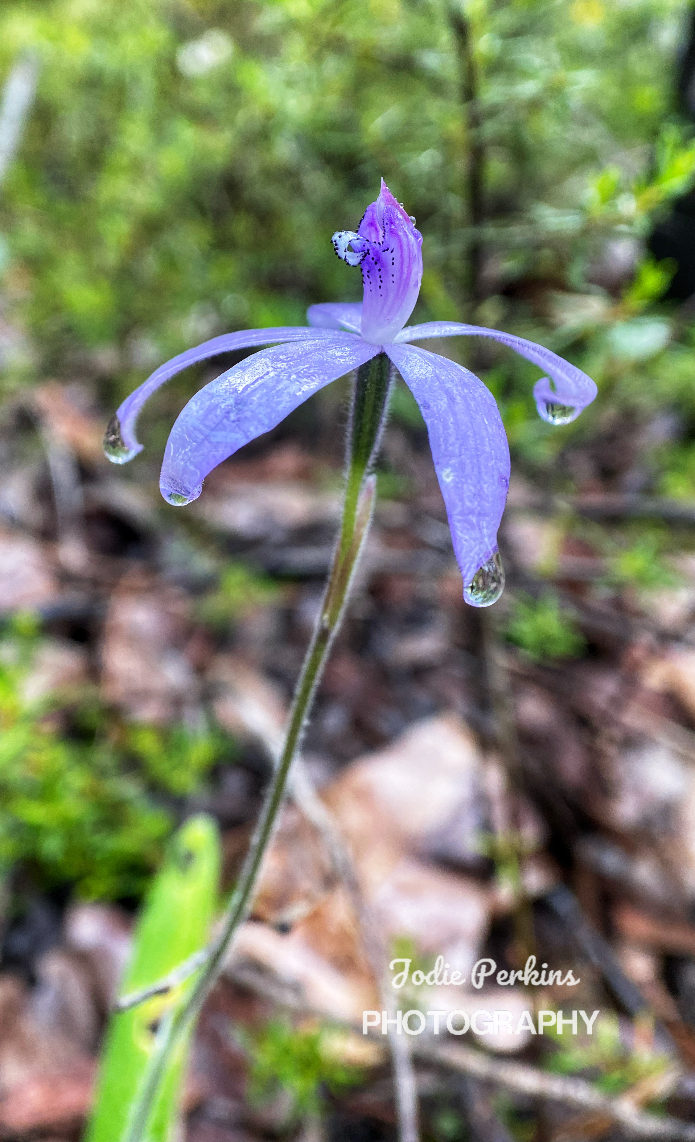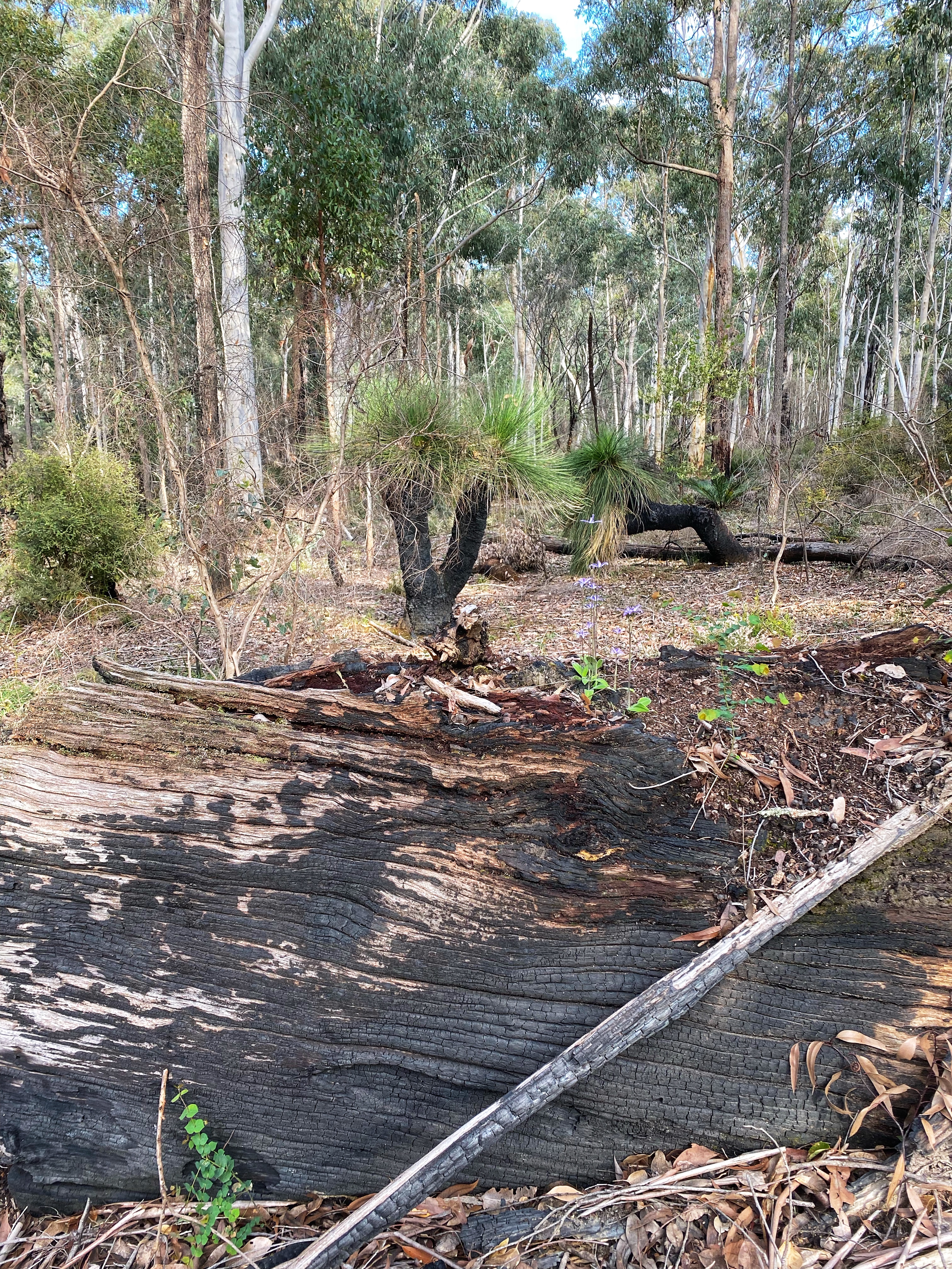 The first part is straight up a steep bitumen road for 300metres or so before heading into bush at the top of the Wellington Dam wall. The first 500 metres is lovely with the water to our left before we venture away permanently from it. Most of the way is up hills. Some go for longer than others and it is a clear effort to get to our destination. I spot a million Silky Blue Orchids, their vibrant blue colour contrasting with the Forest colours. The effects of the prescribed burn in 2019 is still obvious. With a kilometre to go, Ambles has had enough, his feet are hurting, his shoulders are hurting as he hasn’t adjusted the backpack right and all the weight is on his shoulders. He zooms pass me while I’m taking photos of some beautiful delicate Pink Fan Orchids and I don’t catch up until Arcadia Campsite.