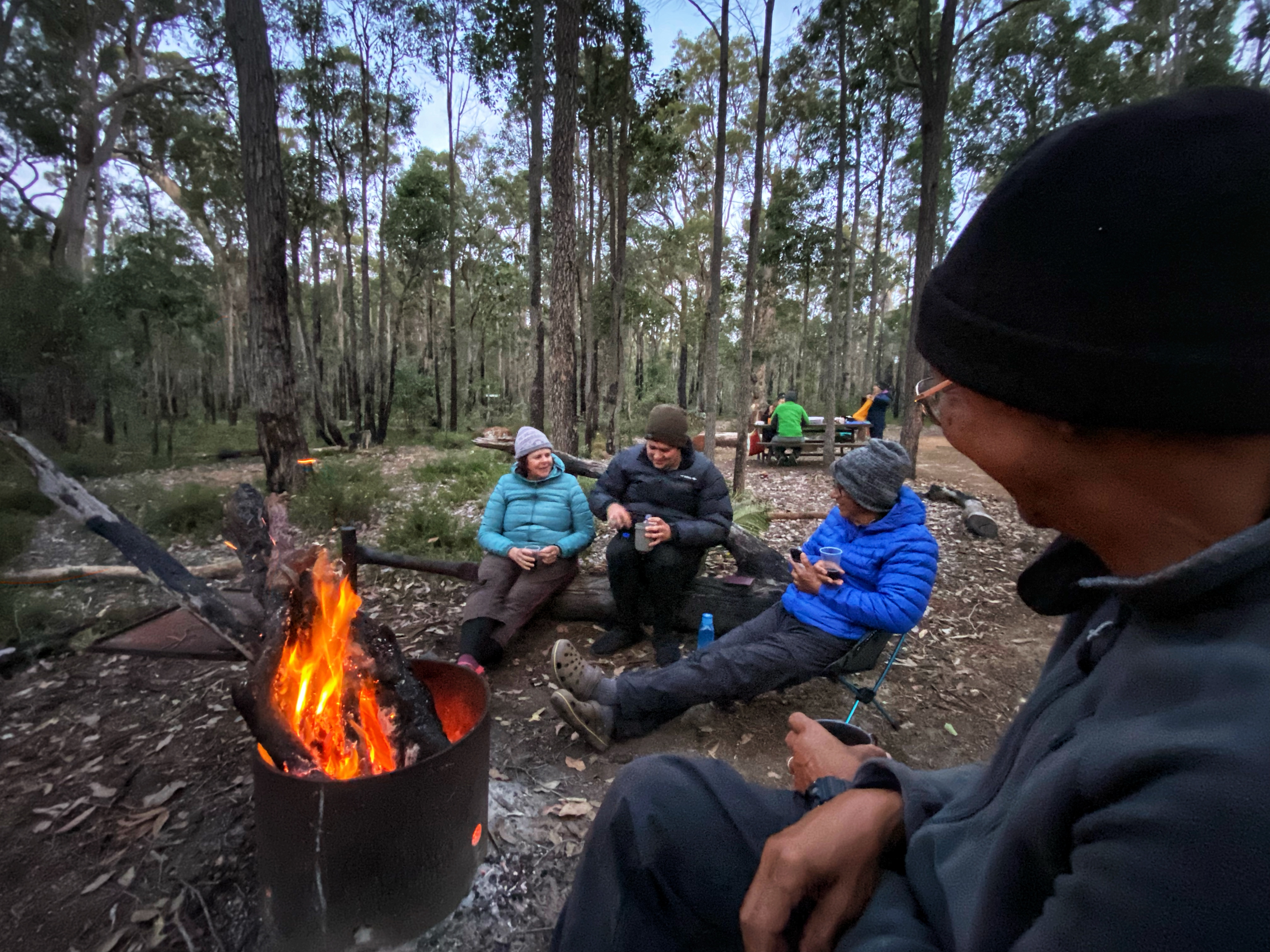 Olli and Viv come in not far behind us. They were informed and decided to tent it. Viv was so tired in fact we never saw her again until the morning. She crashed early without dinner. We didn’t see much of Olli only while he prepared his meal. Simone marches in not happy Jan! She has had a rough day and not in the mood to deal with the 4 guys. She sets up also in the shelter as does Ben. Some other section hikers come in, they tent outside and one called Isis hiking northwards, sets up in the shelter so now it is a full house again in the shelter plus the two guys down at the pub. We are enjoying each other’s company, chatting over the campfire and it’s after 7pm. I notice 4 sets of head torches coming our way and hiss to Ambles ‘They are coming back!’ But they turn out to be 4 women around my age. We find out the next day they call themselves the ‘Kalgoorlie runners’ and have trail run Collie to Balingup in two days. Well the lead woman demands room is made in the shelter for them. Simone tells them about the 4 guys and is very polite. Simone and the other two move their sleeping bags to make room. The women arriving late with absolutely no hut etiquette pick up the guys stuff on the bottom platform and chuck it above with the other guys stuff then they proceed to set up their sleeping bags and ready to turn in for the night. Simone asked them if they carry tents which they claim to. In that case, arriving late and the shelter being full, they should have set up their supposed tents they had.