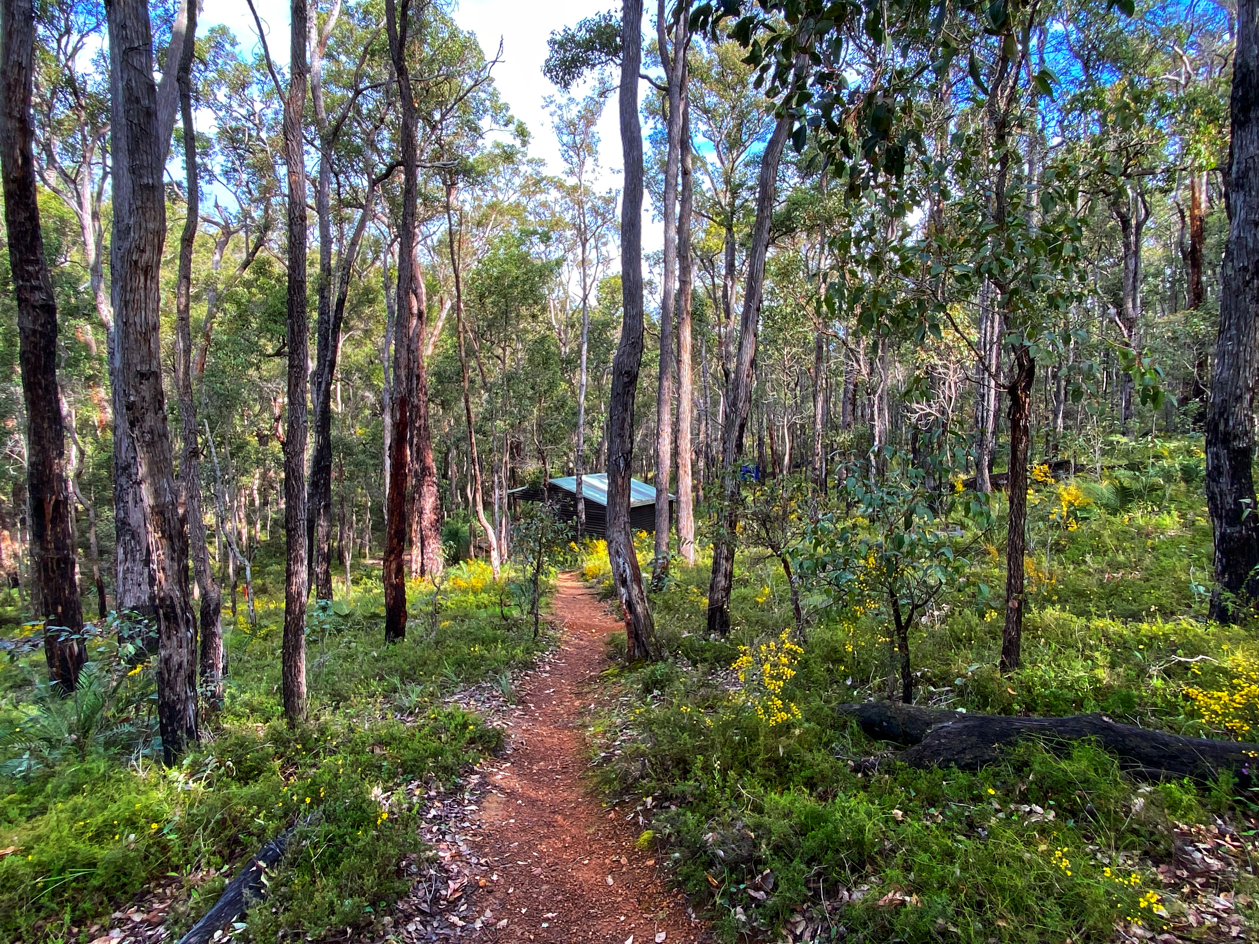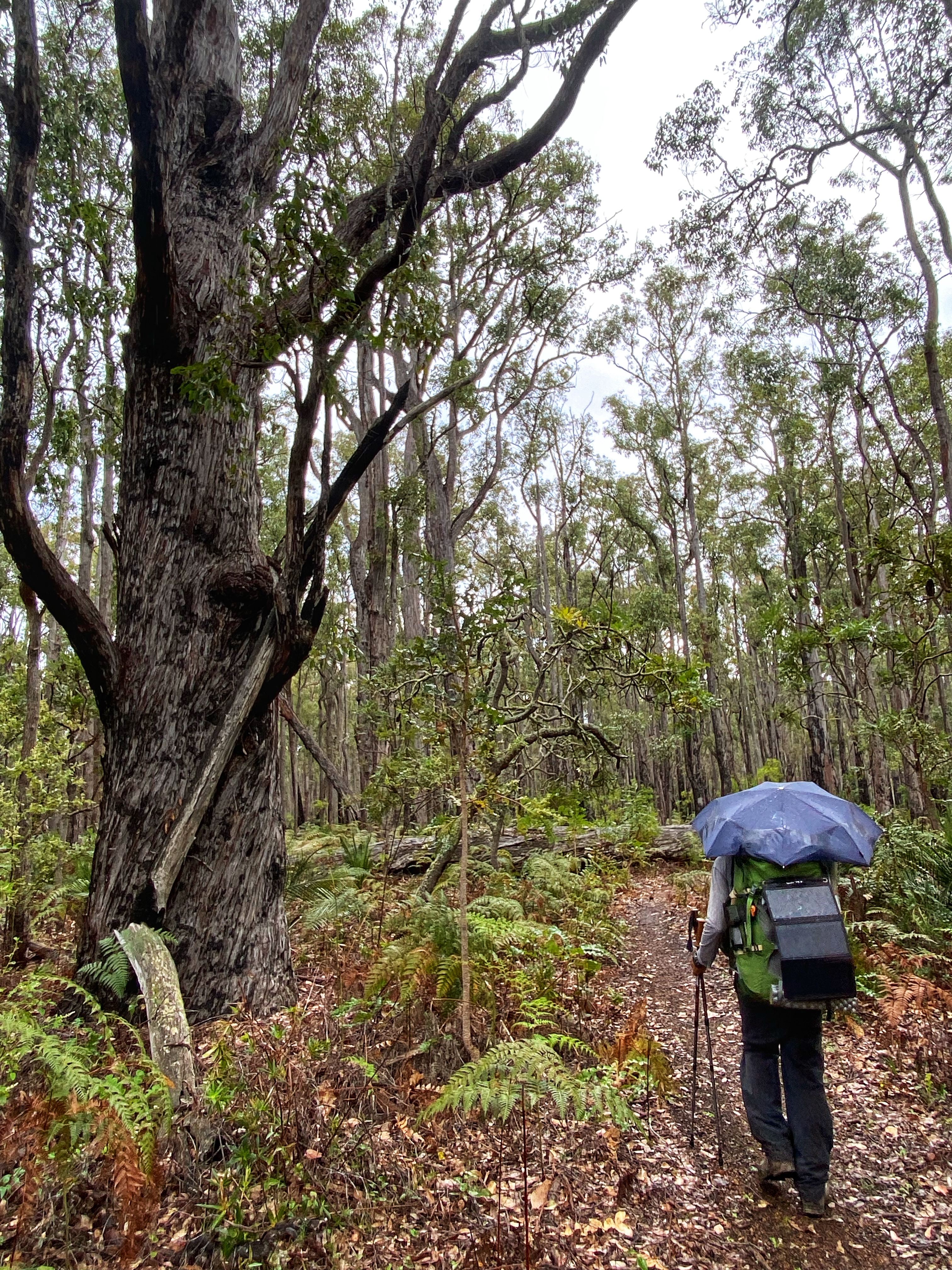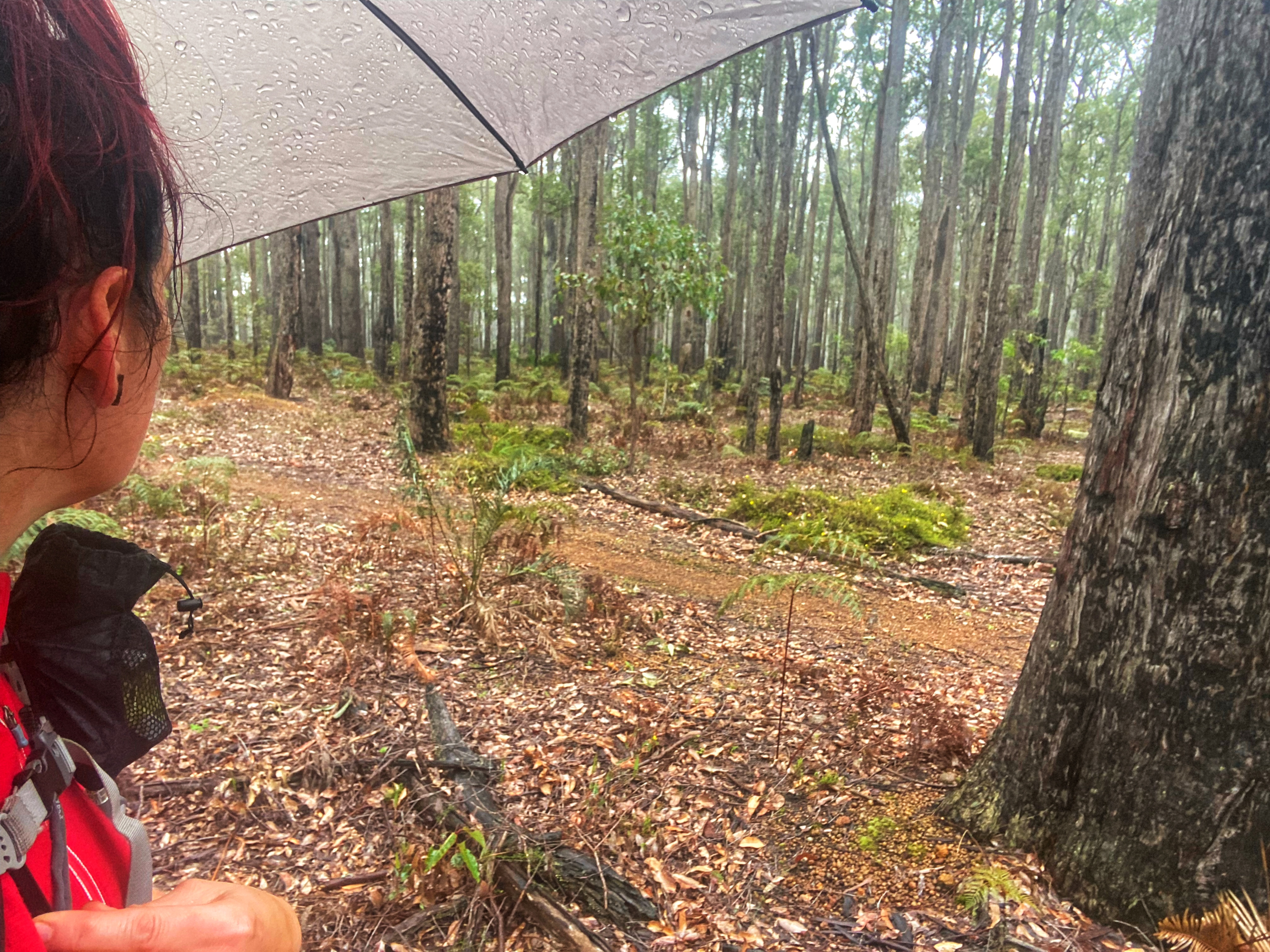 Motorcycle trail riders should not be using the Bibbulmun track, but here they were, ripping it up, a whole family of them speeding pass us, their noisy machines upsetting the peace and tranquillity of the forest. And today it rained on and off, on and off in such an annoying way. No sooner I put my umbrella away, it starts to rain again! I was thinking it will be too hard to stop for lunch on the track. Determined to push all the way to Grimwade but it was meaning a late lunch. I noticed new orchid leaves popping up and wondered what they will be. There wasn’t much besides a sea of yellow wildflowers in places.