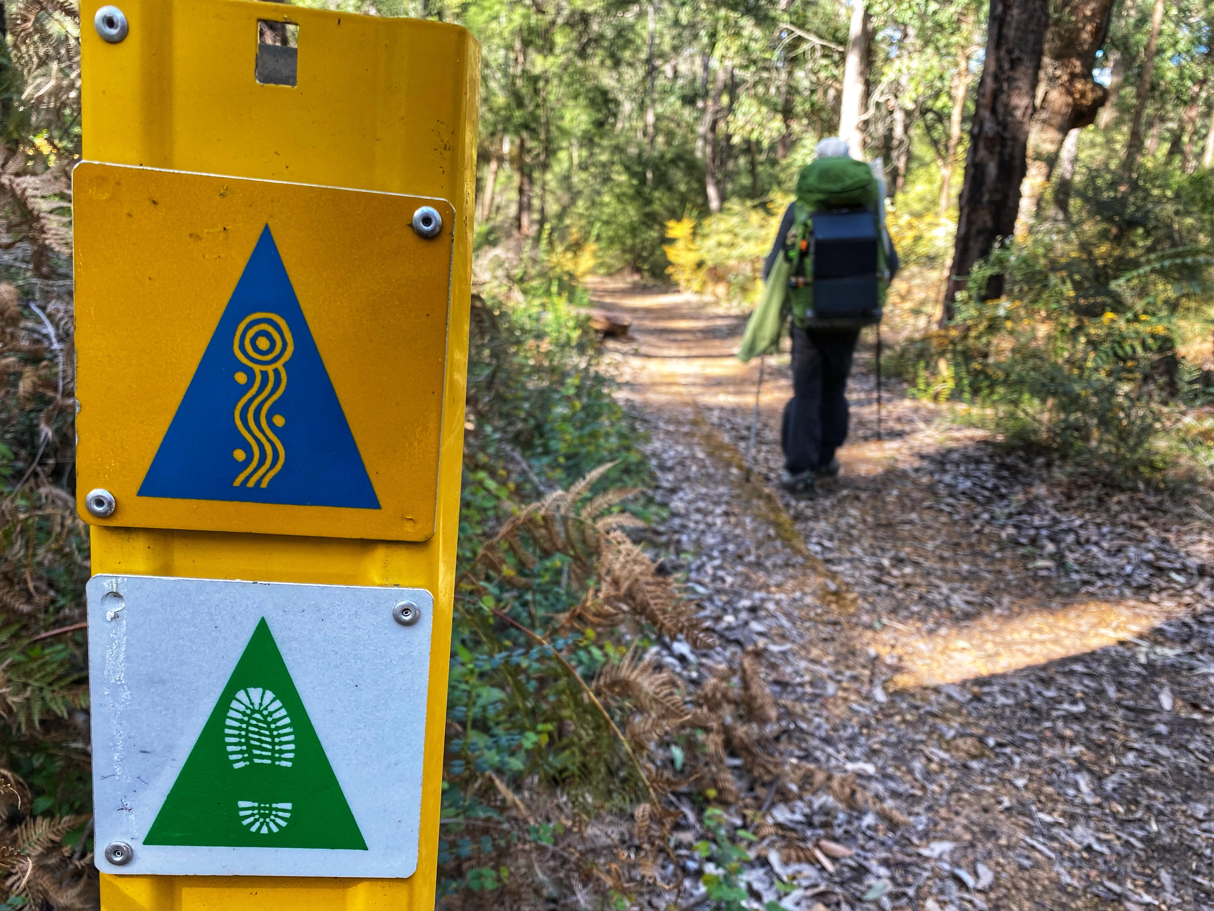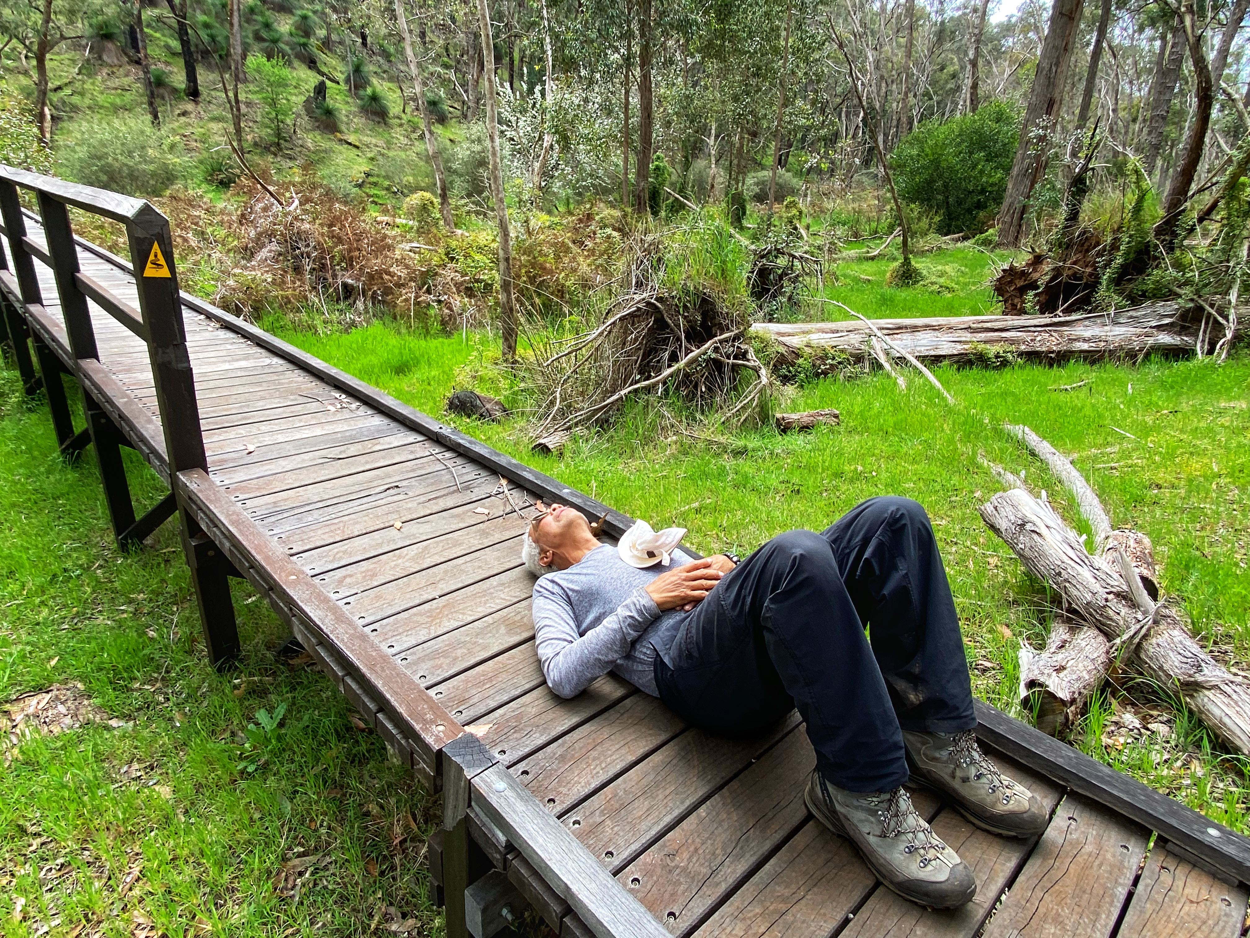 Back to Grimwade campsite and Ambles and I took off third expecting Simone and Ben to leapfrog us so we said see you later and goodbye to Olli and Viv that we knew we wouldn’t see again. Olli goes to Ambles, “Thanks for the laughs!” Those two are amazing and they will complete their end to end, I just know it. Once again, I start briskly and fresh though feet and legs hurt. I have a painful twang in my right shoulder which I always get. I wonder if I pull my shoulders up unconsciously when I hike as I got that problem even with a light daypack on. It was a longer day 23.5kms and 2 years ago this day was bloody hard walking into Balingup. Once again I was way ahead and would find a nice log to sit on periodically and wait for Ambles. More forest walking before we get to farming countryside views and Don’t miss that waugal marker turnoff down to the highway, across it and one big steep hill climb followed by the steep long descent to Balingup Brook bridge. To be honest, the day was much easier and we were smashing it! By midday I had reached the bridge ahead of Ambles and had stretched out resting. There was only 4kms left into town. Ambles said we could grab lunch in town and I was thinking nah it would be too late by the time we get there. Simone from Traaverse was picking us up between 2.30 and 3pm to take us back to Collie.